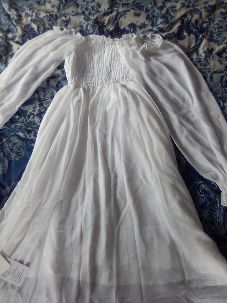 Pavasario rudens moteriškos elegantiškos išeiginės suknelės pūstomis rankovėmis, raižytais kaklu nuo pečių, baltos spalvos šifono suknelės