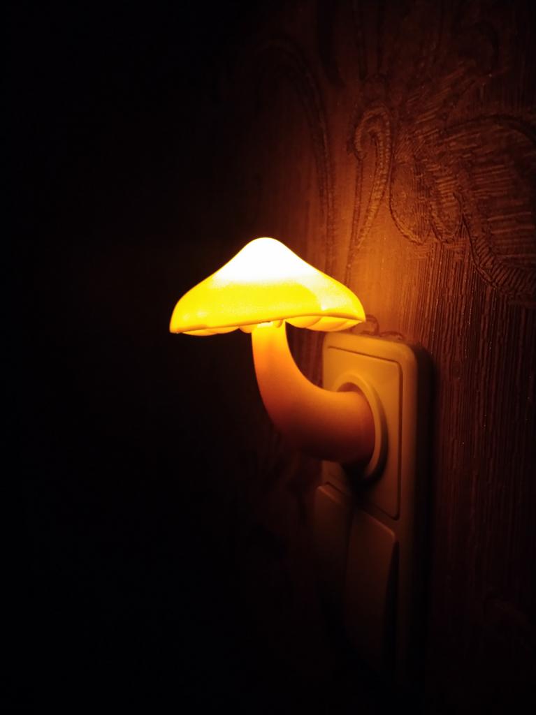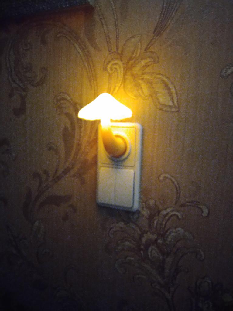 Grybelis dekoratyvus, nelabai ryškus, bet visiškai sutemus šviečia, kad neįsijungtų pagrindinė šviesa. ačiū.