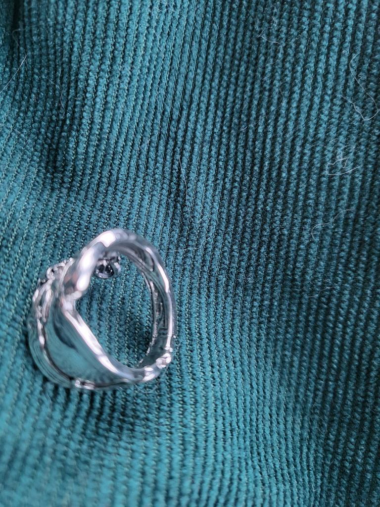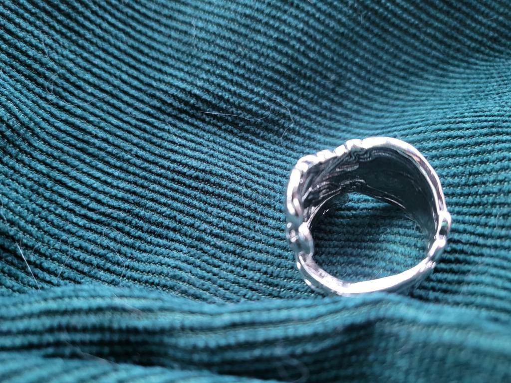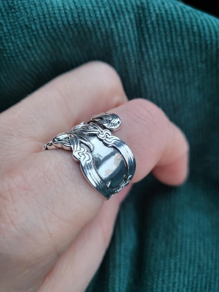 Stilingas žiedas, stilingai atrodo ant nykščio. Bet jis nėra pajuodęs, kaip nuotraukoje, o tiesiog kaip poliruotas sidabras.