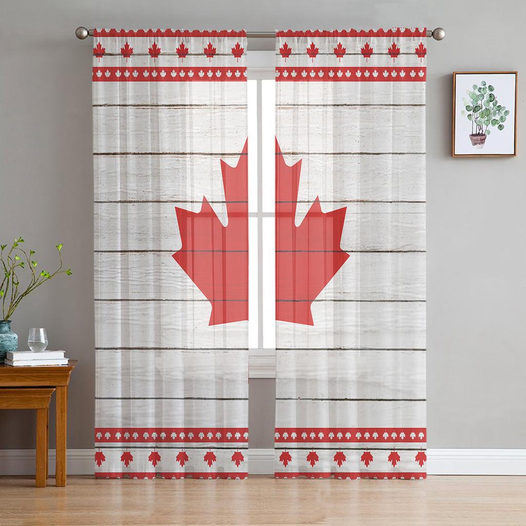 Autumn Maple Leaf Wood Plank Texture Tulle Curtains For Living Room Decoration Modern Chiffon Sheer Voile Kitchen Curtain