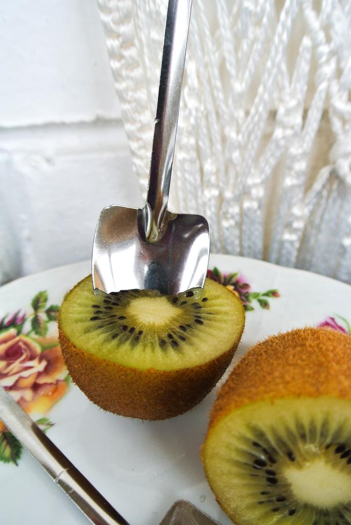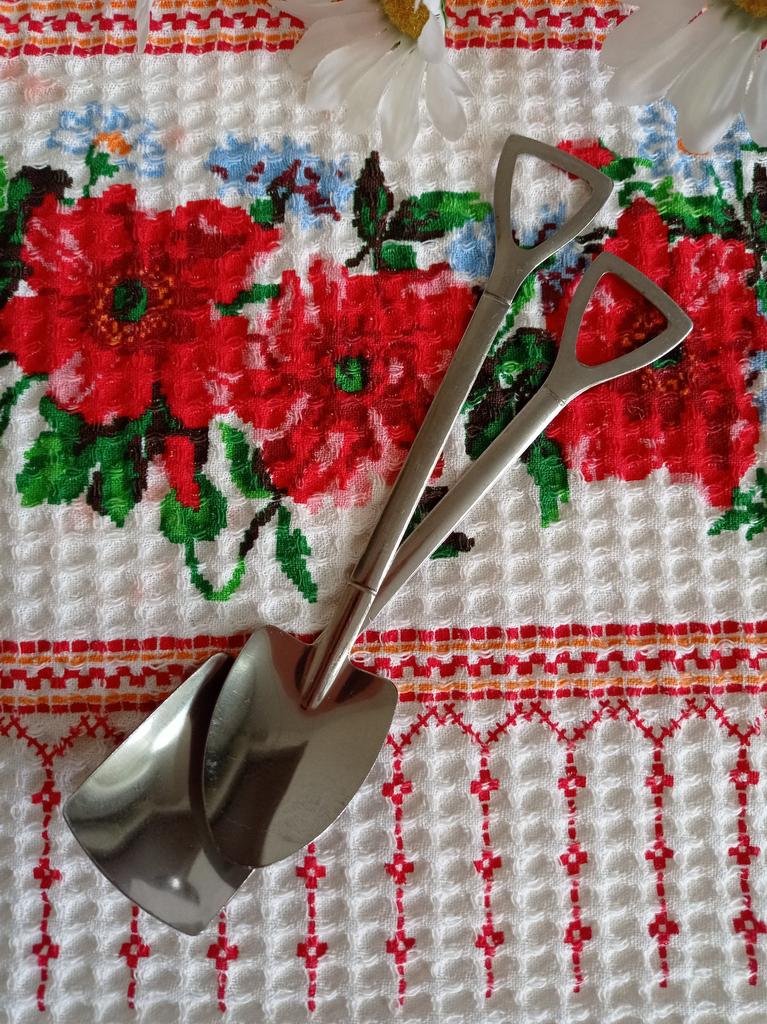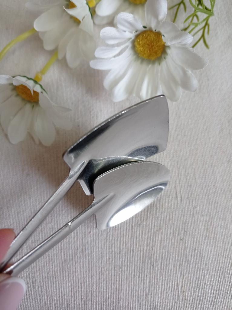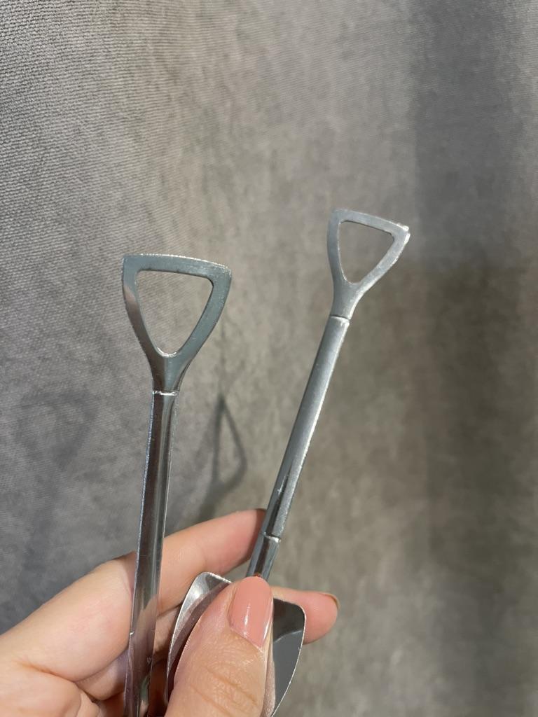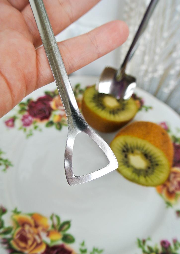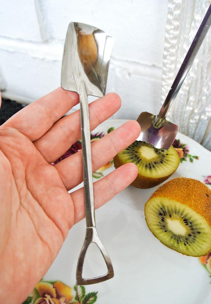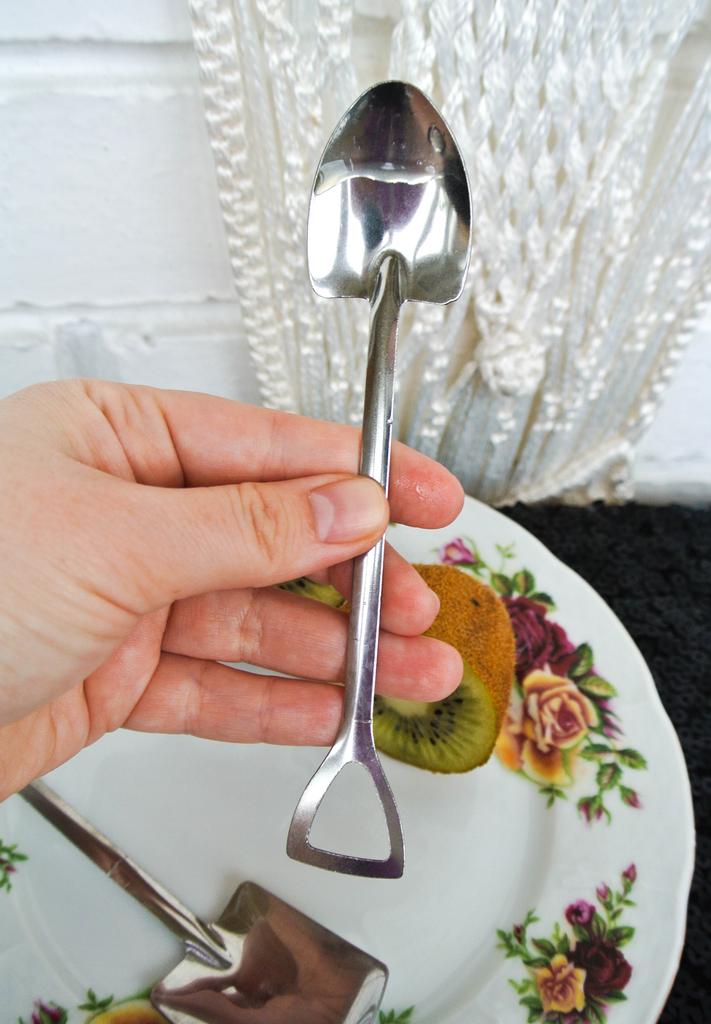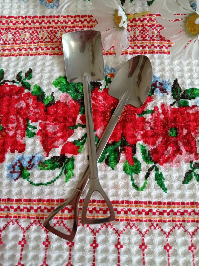 Dviejų kastuvo formos arbatinių šaukštelių rinkinys. Skirta vaisiams, bet galite įdėti ir į cukraus dubenį ir panaudoti kokiai nors sodo puošmenai. Pagaminta iš nerūdijančio plieno. Dydis 3,5 x 15,5 cm. Iš pradžių man atrodė, kad jie buvo aštrūs aplink kraštus, bet manau, kad taip reikia, norint ištraukti iš vaisių minkštimą. Na, o kaina simbolinė perkant iš trijų prekių.