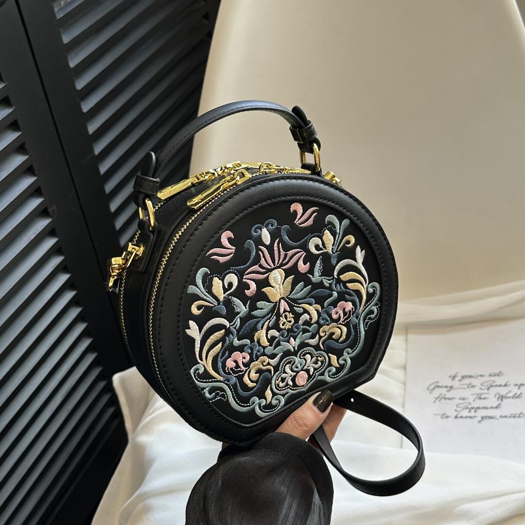 Vintažinė siuvinėta apvali rankinė per petį, rankinė su užtrauktuku, klasikinė, madinga, nišinė krepšys