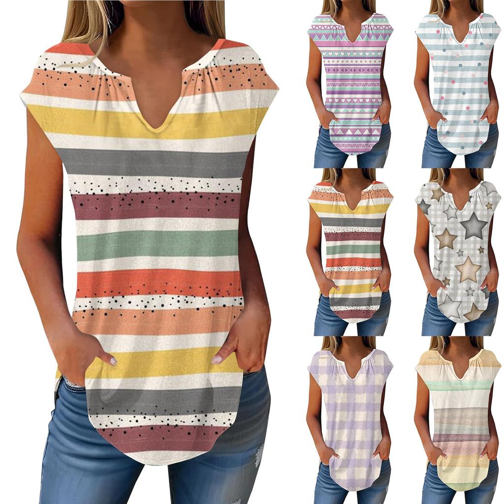 Summer Cap Sleeve T Shirts For Women Trendy Loose Casual Dressy V Neck Pleated Tunic Tank Tops