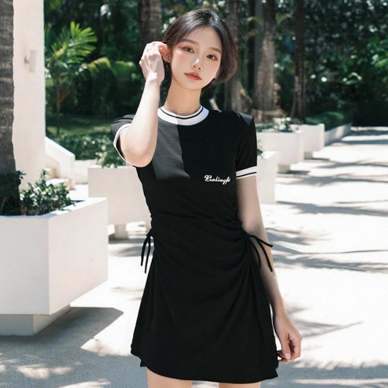 Two-Piece Color Block Korean Swimsuit: Women's Skirted Fashion, Slim Fit, Conservative Belly-Covering Design for Holidays.