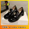 2024 autumn and winter new versatile black round head thick heel patent leather cross flower platform small leather shoes French loafers women