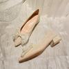 Pointed single shoes women's new thick heel fairy shoes light mouth pearl bow middle heel ladyshoes
