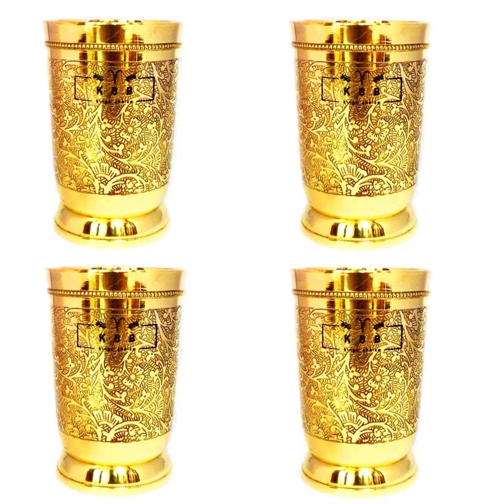 Pure Brass Glass Tumbler with Etching Art Finish, Indian HANDWORKED, (Pack of 4)