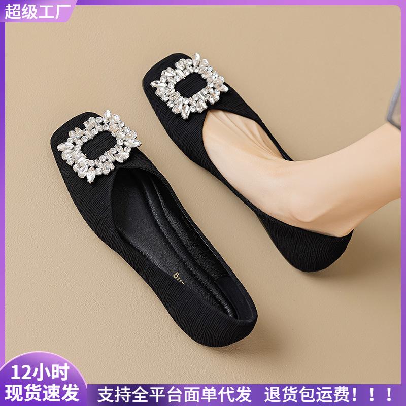 Square head single shoes women's flat bottom one pedal rhinestone soft sole large size women's shoes