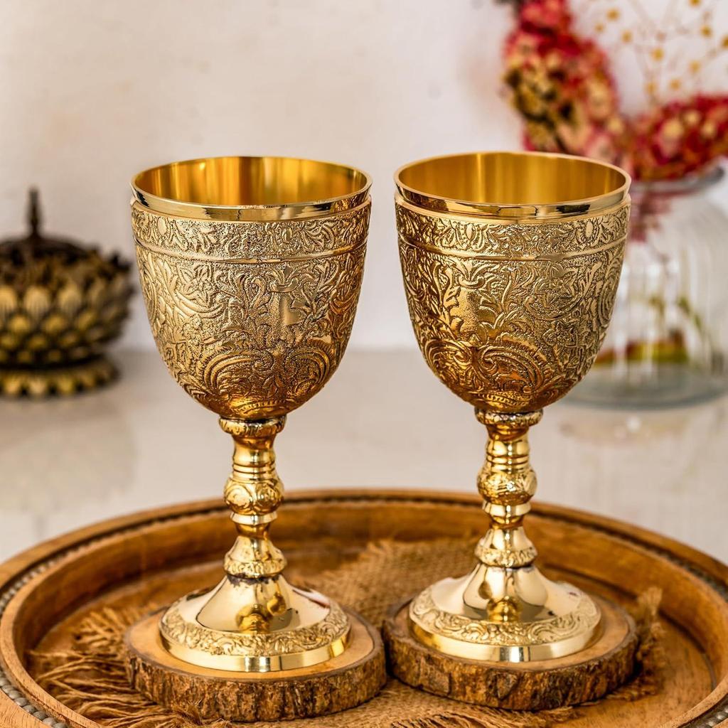 SET CONTENTS: Package includes 2 matching brass wine goblets featuring detailed embossed patterns and sturdy, ornate