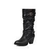 Didelio dydžio minkštos PU medžiagos apvadas su trijų eilių sagtimi moteriškiems vidutinio ilgio batams su smailėjančiu storu kulnu ir flokuota medžiaga blauzdos batams