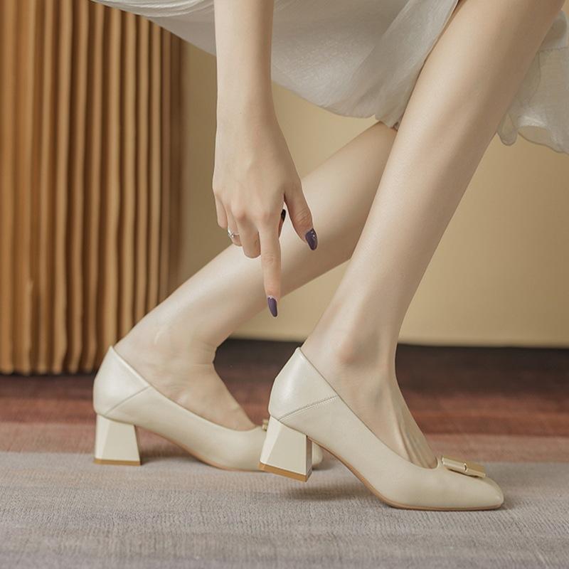 Leather women's shoes spring and autumn 2025 new temperament soft sole thick heel middle heel square head French shallow mouth single shoes high heels