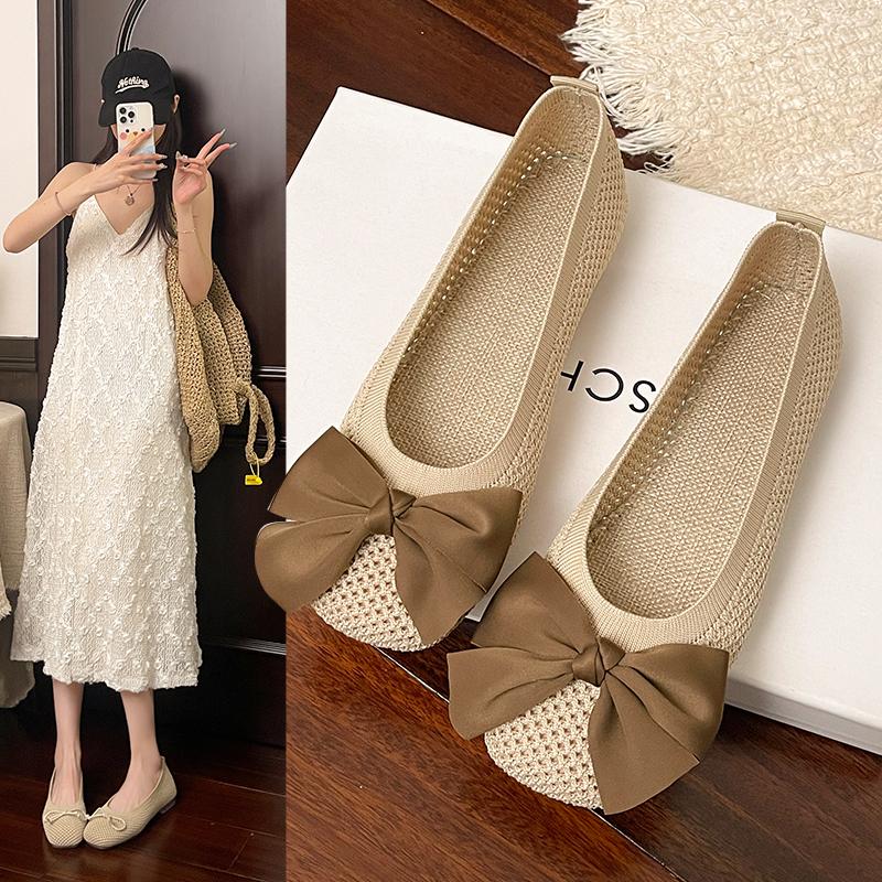 Lovely Sweet Flats for Women Summer Casual Slip on Round Toe Shoes for Women Solid Stretch Fabric Butterfly Knot Casual Shoes