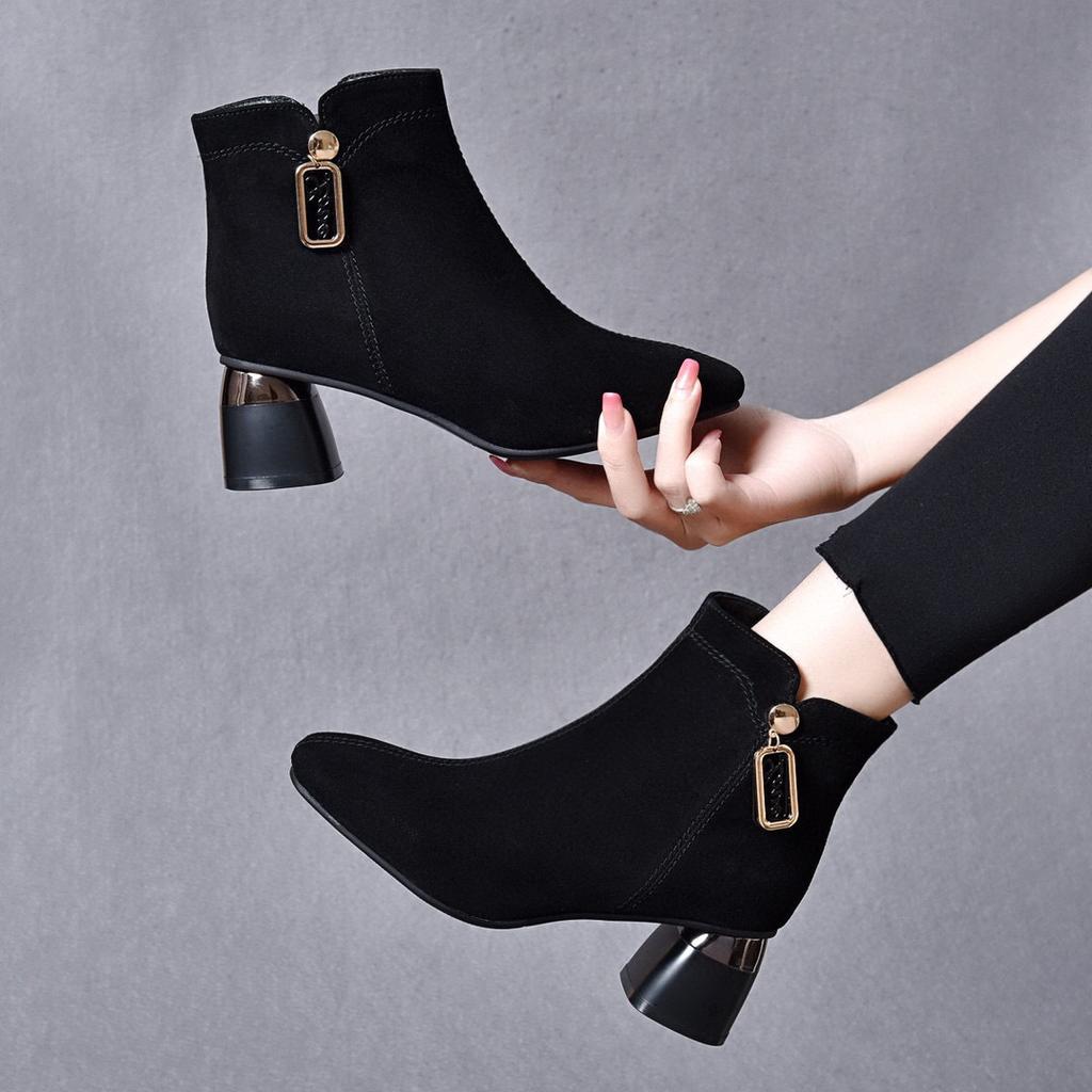 High-heeled fashion boots women's new black sheepskin square buckle thin boots short boots women's leather boots