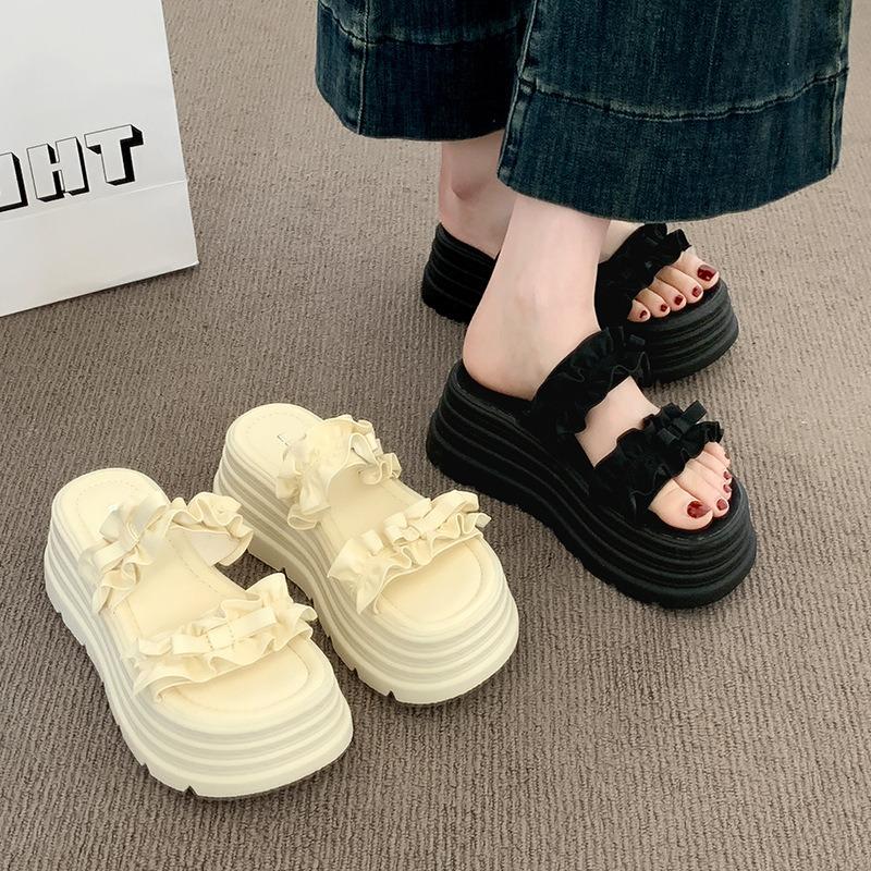 Thick-soled one-word slippers women's summer new pleated lace high-end slope heel high outer sandals