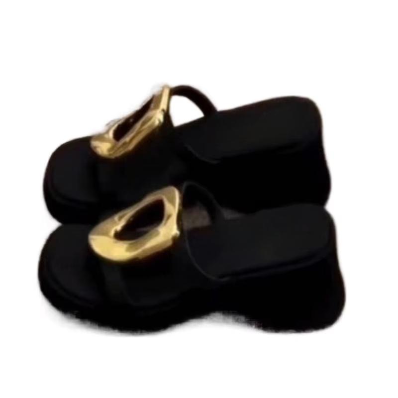 Fashion Summer New Style Slope Heel Sandals Women's Round Head Metal Buckle Waterproof Table Anti-slip Wear-resistant Slippers
