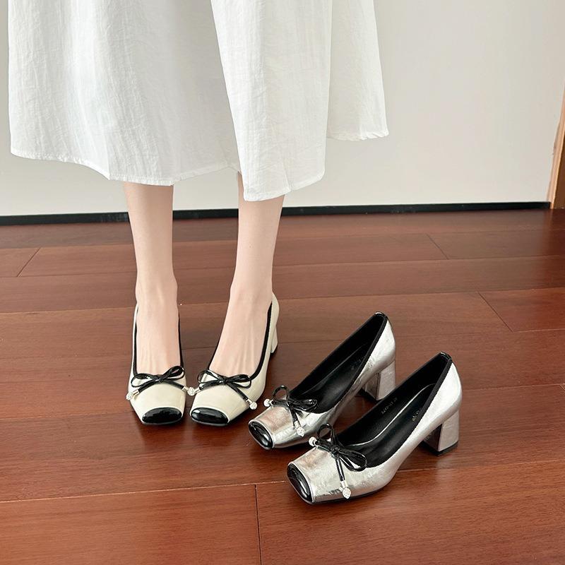 Retro pig nose leather ballet shoes women's bow silver outer wear light mouth thick heel square head Mary Jane shoes