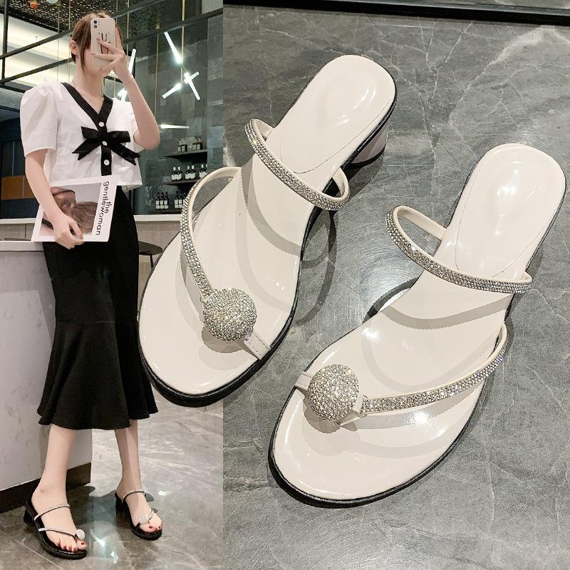 Thick-heeled slippers women's summer outer wear new with skirt rhinestone sandals women's versatile toe sandals