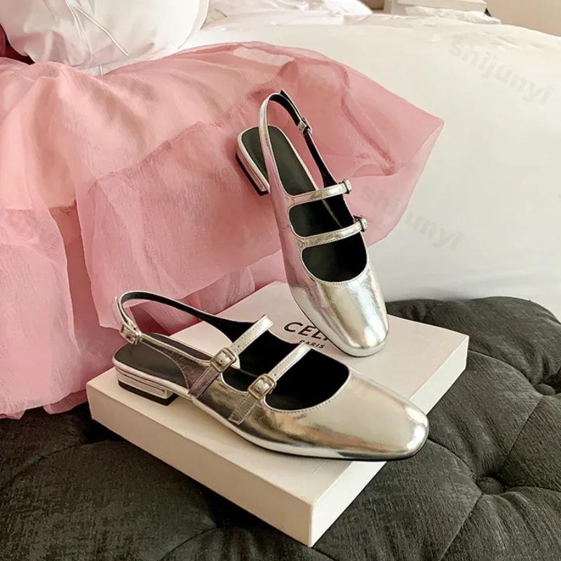 Fashion Women Flats Silver Mary Jane Sandals Female Summer New Leather Mary Jane Strap Fashion Square Toe Shallow Elegant Flats Pumps