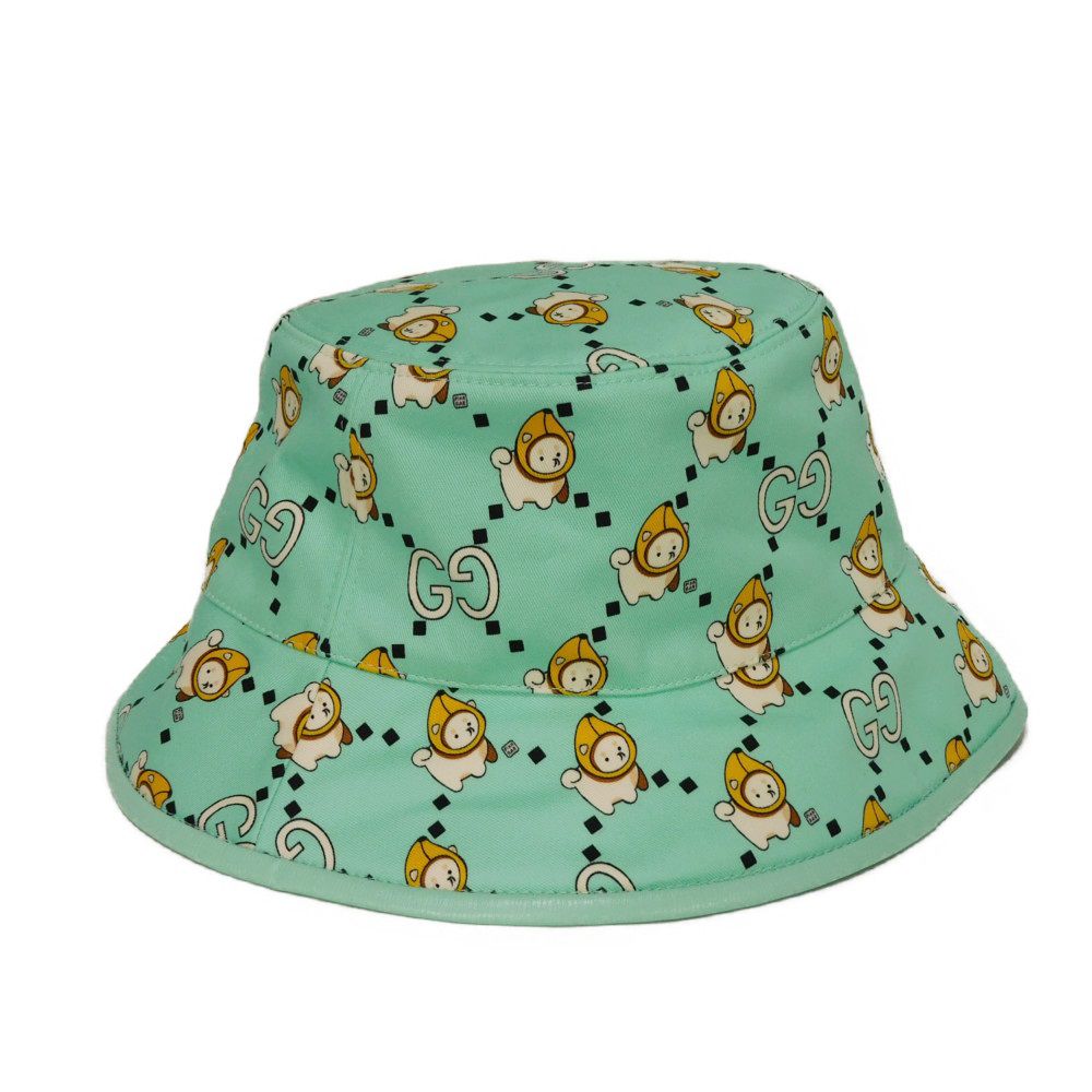 GUCCI Animal Print Bucket Hat 736960 4HAX3 8469 hat M 22.8" Banana and Dog Print Pastel Bag in Excellent Condition GG cotton Light green Women from Japan AUTHENTIC