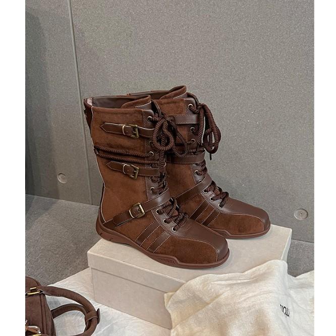 Retro round head splicing lace-up thick-soled Martin boots women's 2025 new niche belt buckle versatile German training boxing boots