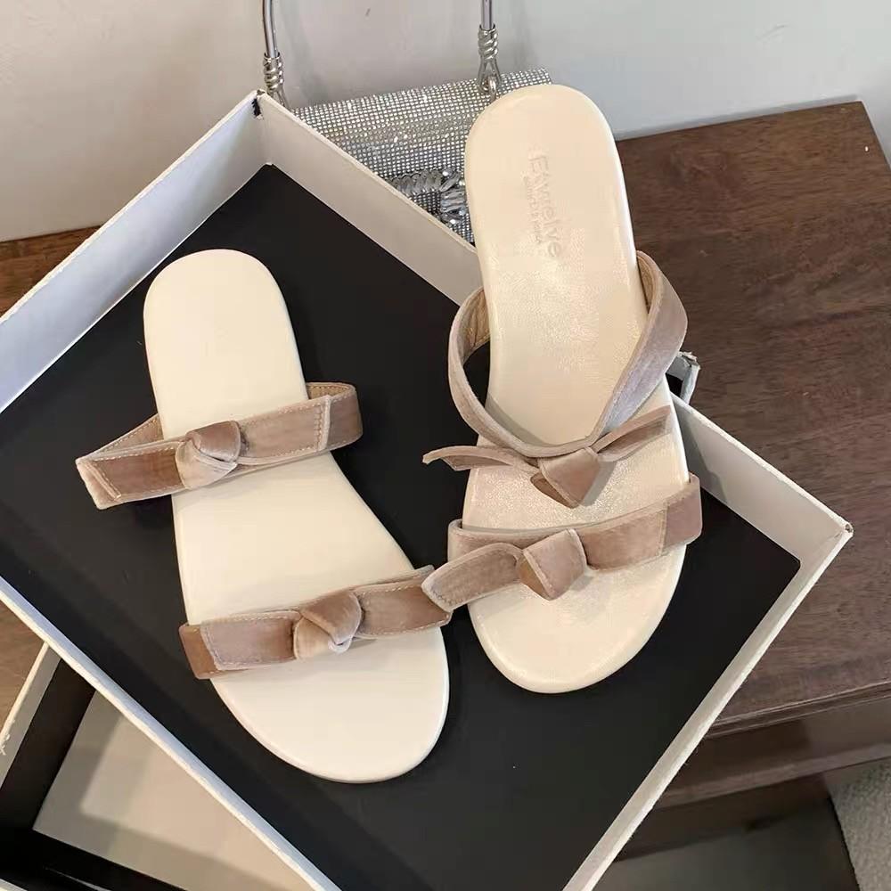 Summer fashion versatile flat bottom word with bow velvet non-slip fairy French new toe girl cool slippers
