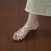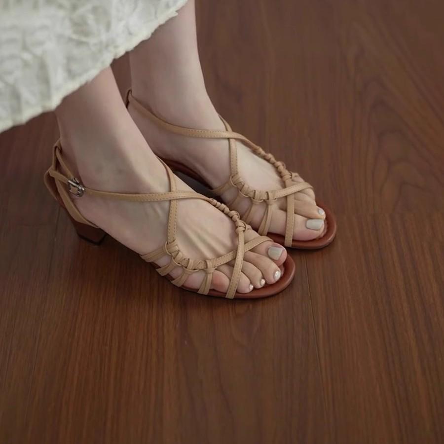 Soft leather version~ French temperament woven hollow word with open toe thick heel sandals fairy vacation style Roman shoes woman