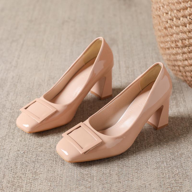 2025 New Spring New Square Head Thick Heels Women's Shallow Mouth Buckle Single Shoes Professional Shoes High Heels