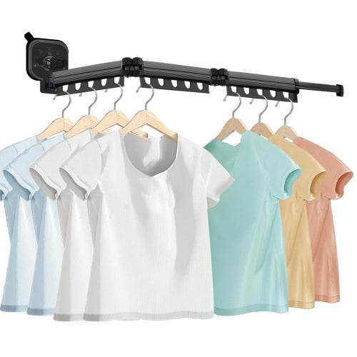 - The suction cup folding design makes this hanger space-saving.It can be swung 180 degrees left and right, and the arm and hanger can be folded.When you don't dry clothes, you can lean against the wall and fold it without taking up space.