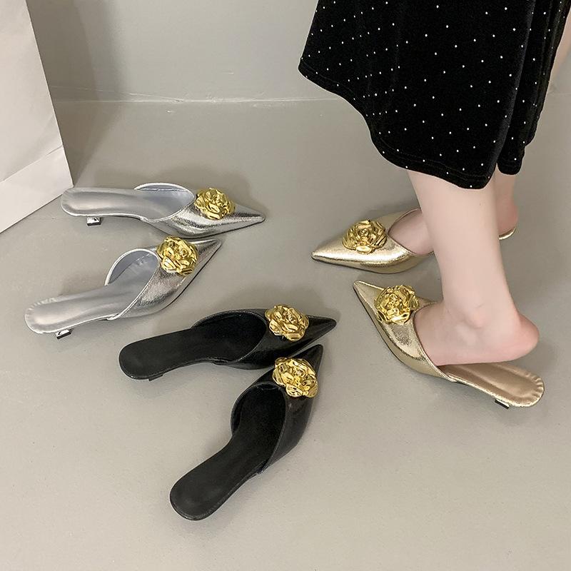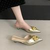 2025 summer new slippers women wear low-heeled sandals metal buckle pointed head thin heel medium heel bag head half slippers women