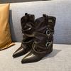 2025 new retro pointed metal buckle pleated short boots thick heel trouser tube boots women's pile boots brown wide boots