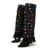 Eilyken Runway Blue Denim Crystal Thin Heels Knee High Boots Stilettos Nightclub Peep Toe Women Shoes Botas Mujer