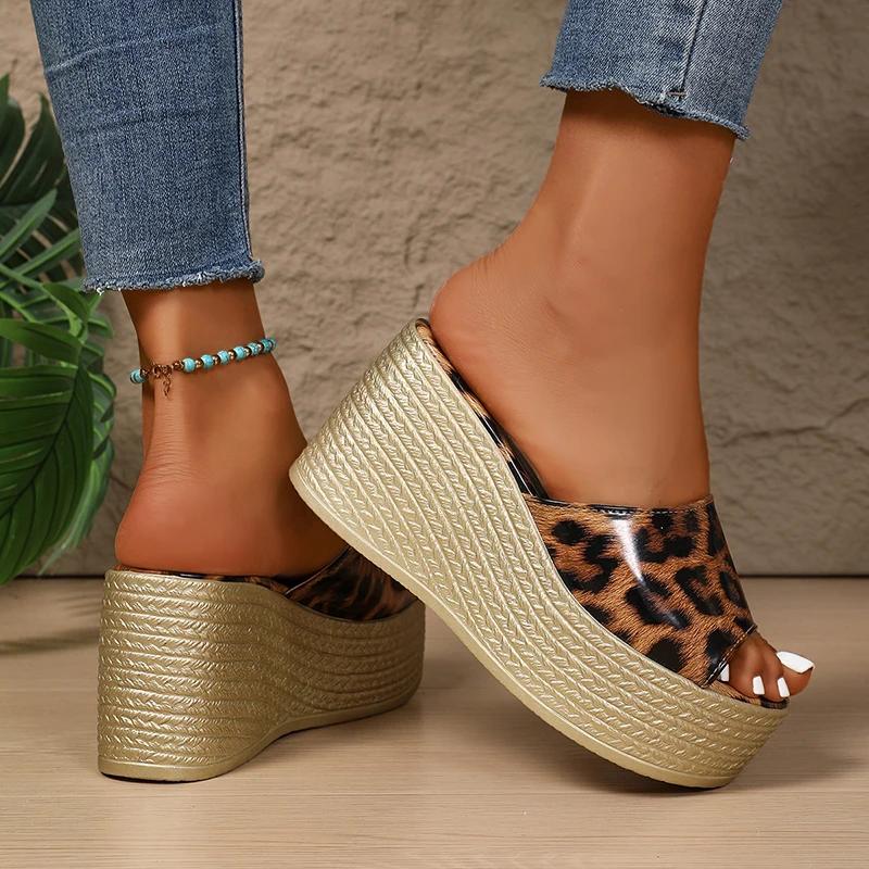 Fashion Leopard Print Thick Bottom Wedge Sandals for Women Fashion Chunky Platform Slippers Woman Summer Peep Toe Non Slip Beach Slides