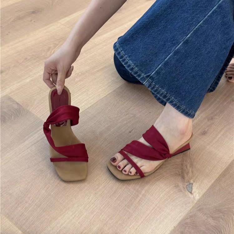 2025 new summer niche design temperament slope heel cool slippers fairy wear one-word high heels slippers