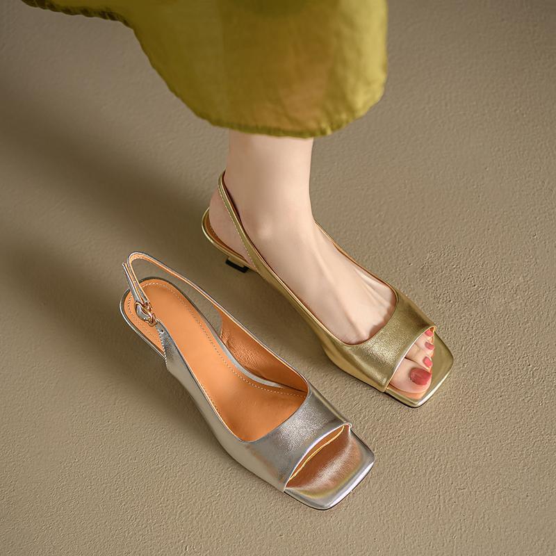 French simple temperament low heel silver sandals women's 2025 summer new square head thin heel cat heel empty Roman shoes women
