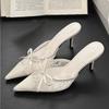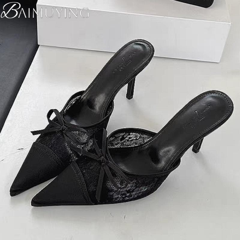 Bow Mesh Lace High Heels Slippers Pointed Toe Women Sandals Mules Shoes 2025 New Summer Trend Dress Pumps Sexy Sandalias Mujer