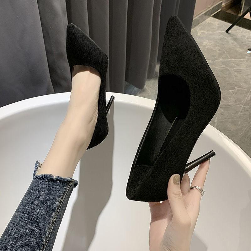 High heels women's spring and autumn new black thin heels pointed head light mouth suede professional shoes large size etiquette shoes