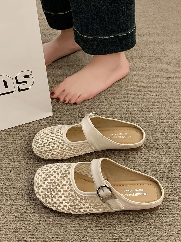 French hollow woven one-word buckle Roman sandals new round head flat bottom Mary Jane hole shoes