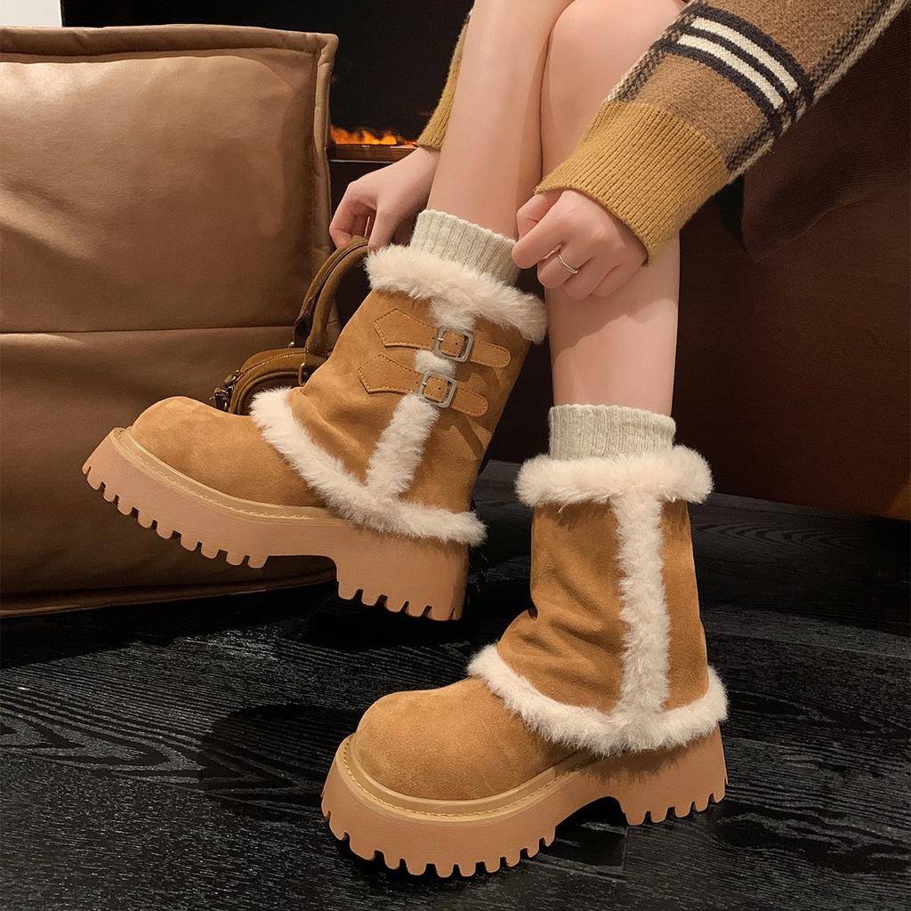 Thick-soled medium tube snow boots women's 2025 new winter fur integrated fleece Altay warm wool cotton shoes