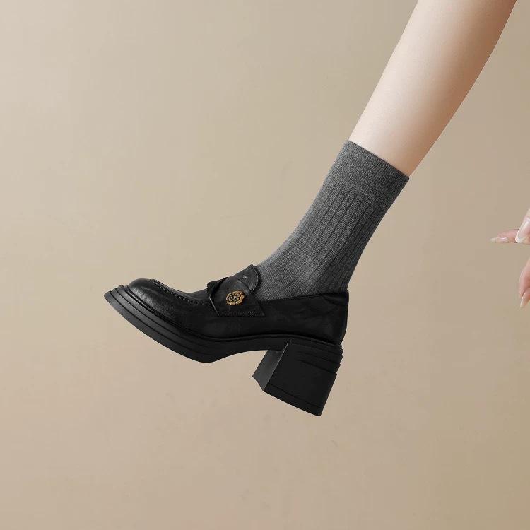 Soft leather version~ British style small leather shoes are versatile and beautiful, camellia thick heel small high heel single shoes, loafers