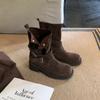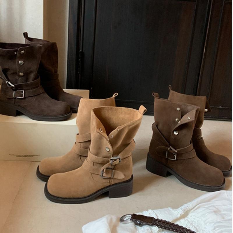 Cowhide version~ Height increase 5.5cm Maillard thick heel thick sole belt buckle thin thick heel short boots locomotive boots women's autumn