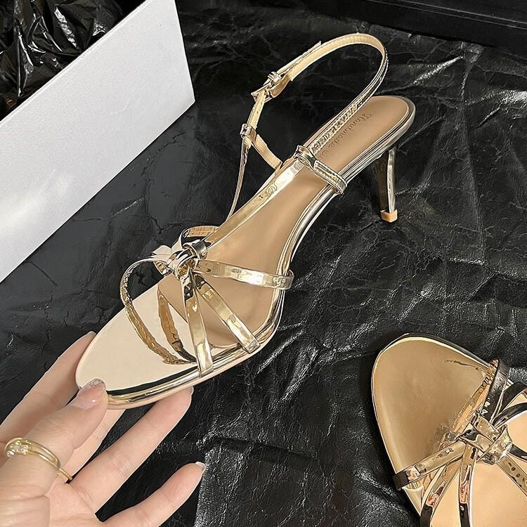 Beautiful golden high heels~ 2025 summer full leather thin belt one-word buckle open-toed sandals women, free shipping