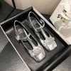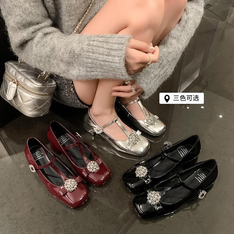 Spring 2025 new Mary Jane shoes fairy rhinestone bow French leather T-shaped shoes with thick heels