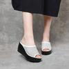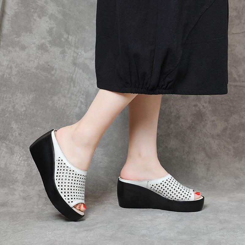 Soft cowhide wedge slippers women's thick-bottomed waterproof table summer new wear high-heeled fish mouth hollow sandals women