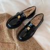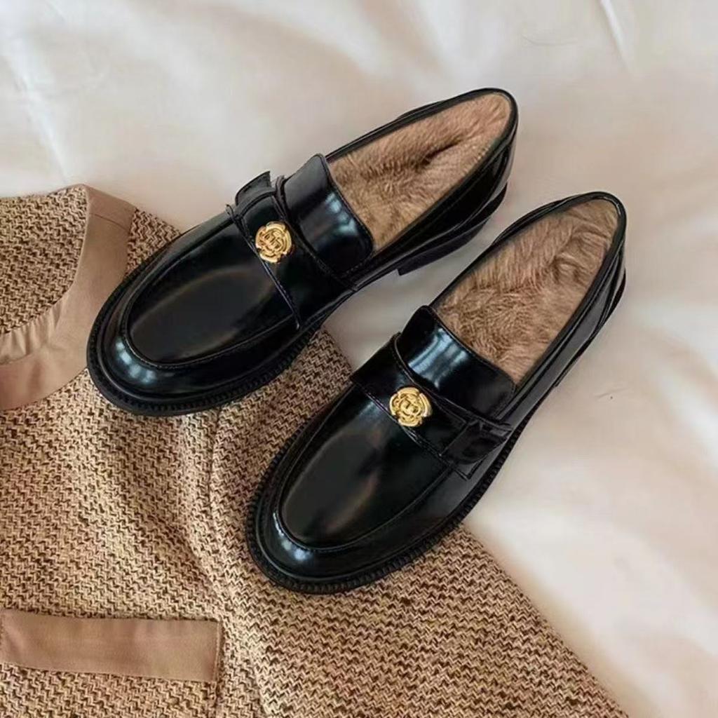 Inner heightening velvet loafers soft leather camellia gold buckle small leather shoes female British style one pedal thick heel single shoes