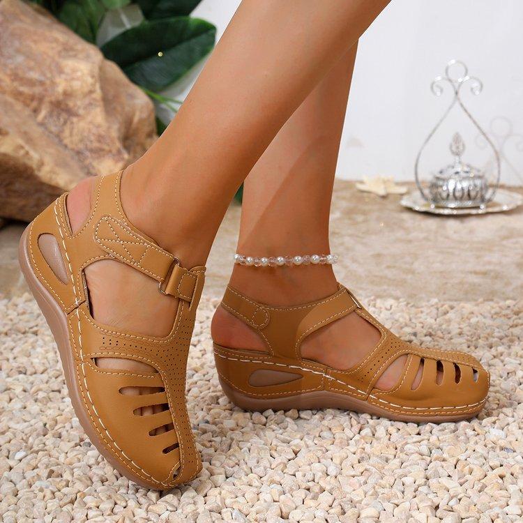 Large size thick sole hollow round head Roman sandals summer new Velcro buckle with rocking line women's shoes
