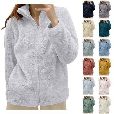Moteriškas pūkuotas flisinis švarkas ilgomis rankovėmis su stačia apykakle, užsegamas visu užtrauktuku, šerpinis paltas rudeniui ir žiemai, šiltas švarkas su kišenėmis