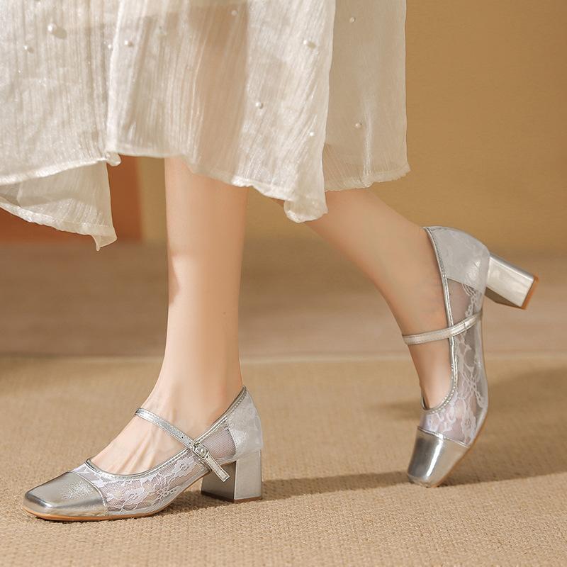 Silver sheepskin single shoes women's summer mesh breathable new style thick heel light mouth Mary Jane women's shoes