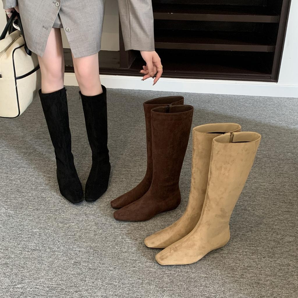 2025 new square head suede tall tube thin but knee low slope heel side zipper knight women's boots