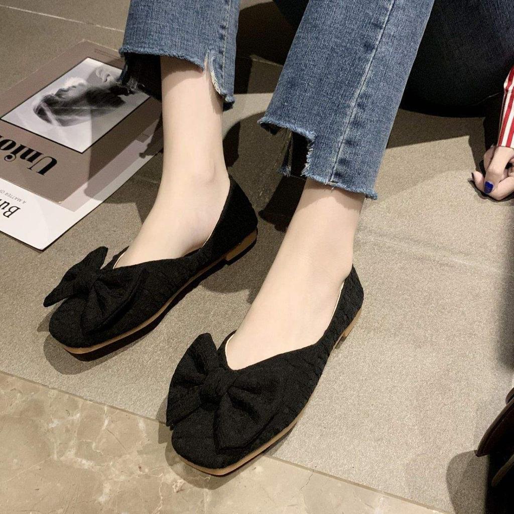 Doudou shoes 2025 new flat-bottomed women's spring shallow bow square head with skirt student fairy shoes