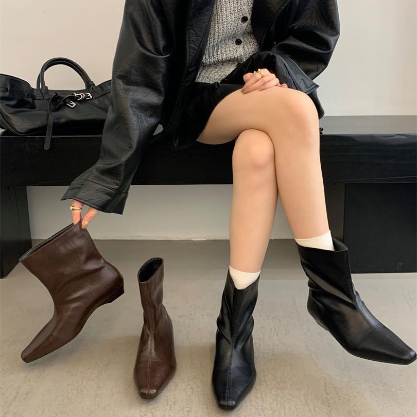 2025 Autumn Low Heel Boots Square Head Short Boots French Temperament Slope Heel Short Boots Solid Color Straight Boots
